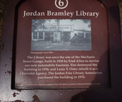 The former Mechanic Street Garage was destroyed by fire in 1950, and rebuilt as a Chevrolet Agency. In 1970 it was purchased by the Jordan Free Library Association, and refurbished as the new Horace W. Whiteley Memorial Building / Community Center, which also houses the Jordan Historical Museum.